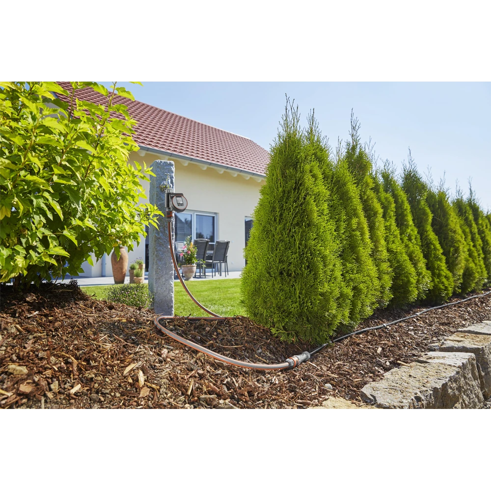 Ben je altijd veel tijd kwijt om je tuin te sproeien? Dan gebruik je de Gardena besproeiingscomputer Flex Control. Sluit de besproeiingscomputer aan op je buitenkraan (diameter binnendraad: 26,5 millimeter of 33,3 millimeter) en stel met de draaischijf de tijd in wanneer de sproeier aangaat en hoe lang de besproeiingscomputer moet sproeien. De computer sproeit maximaal 100 minuten achter elkaar. Ook stel je de waterinterval naar eigen wens in. Dit is mogelijk van 4 tot en met 72 uur.