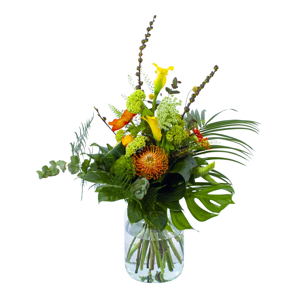 Dit bladboeket diverse prachtige bloemen. De combinatie van de verschillende gele, oranje en groene bloemen geven het boeket unieke uitstraling. Een boeket dat in vrijwel elk interieur past. Bovendien geschikt voor verschillende gelegenheden. Feliciteer, bedankt of verstuur zomaar dit prachtige handgebonden boeket en verras de ontvanger! * Exclusief accessoires en vaas