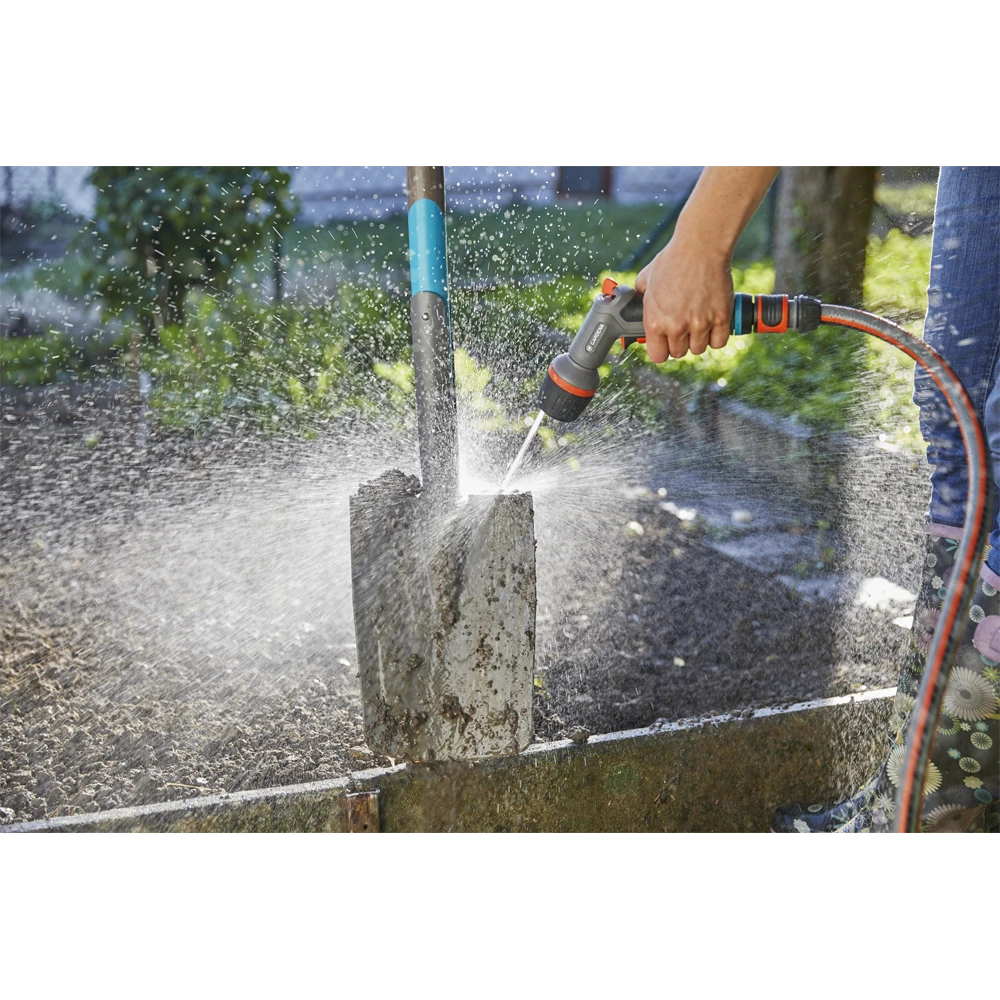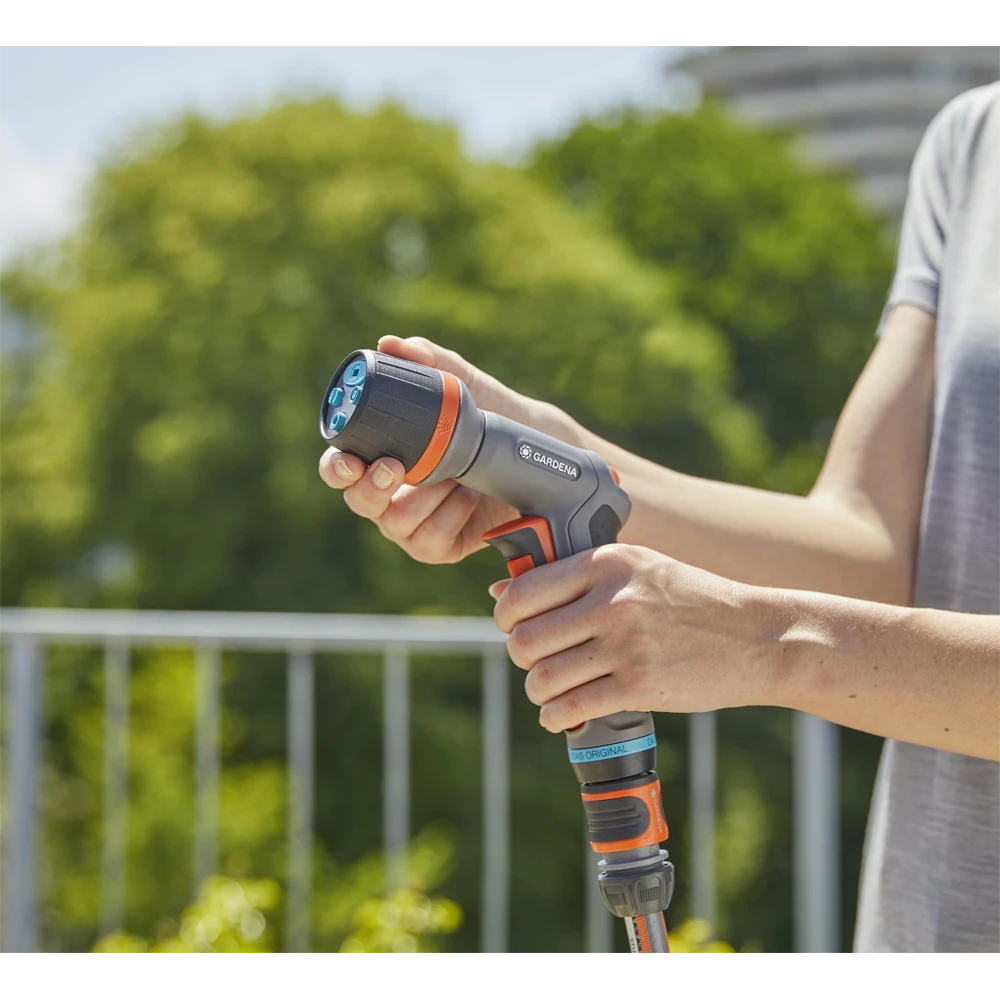 De GARDENA Comfort Reinigingspistool ecoPulse™ is geschikt voor zowel effectieve reiniging als voor besproeiing. De sproeier heeft de innovatieve ecoPulse™-straal. De oscillerende waterstraal is bijzonder effectief tijdens het reinigen van oppervlakken en bespaart tot 40 procent water in vergelijking met de standaard GARDENA harde straal. Drie andere spuitstanden (harde straal, vlakstraal en nevel) kunnen worden ingesteld. Het ergonomische handvat met zachte kunststofonderdelen zorgt voor optimaal bedieningscomfort tijdens het gebruik. De waterstroom kan traploos worden aangepast. Voor continue reiniging of besproeiing kan de pulstrekker worden vergrendeld om te voorkomen dat uw hand vermoeid raakt. Met geïntegreerde vorstbeveiligingstechnologie.