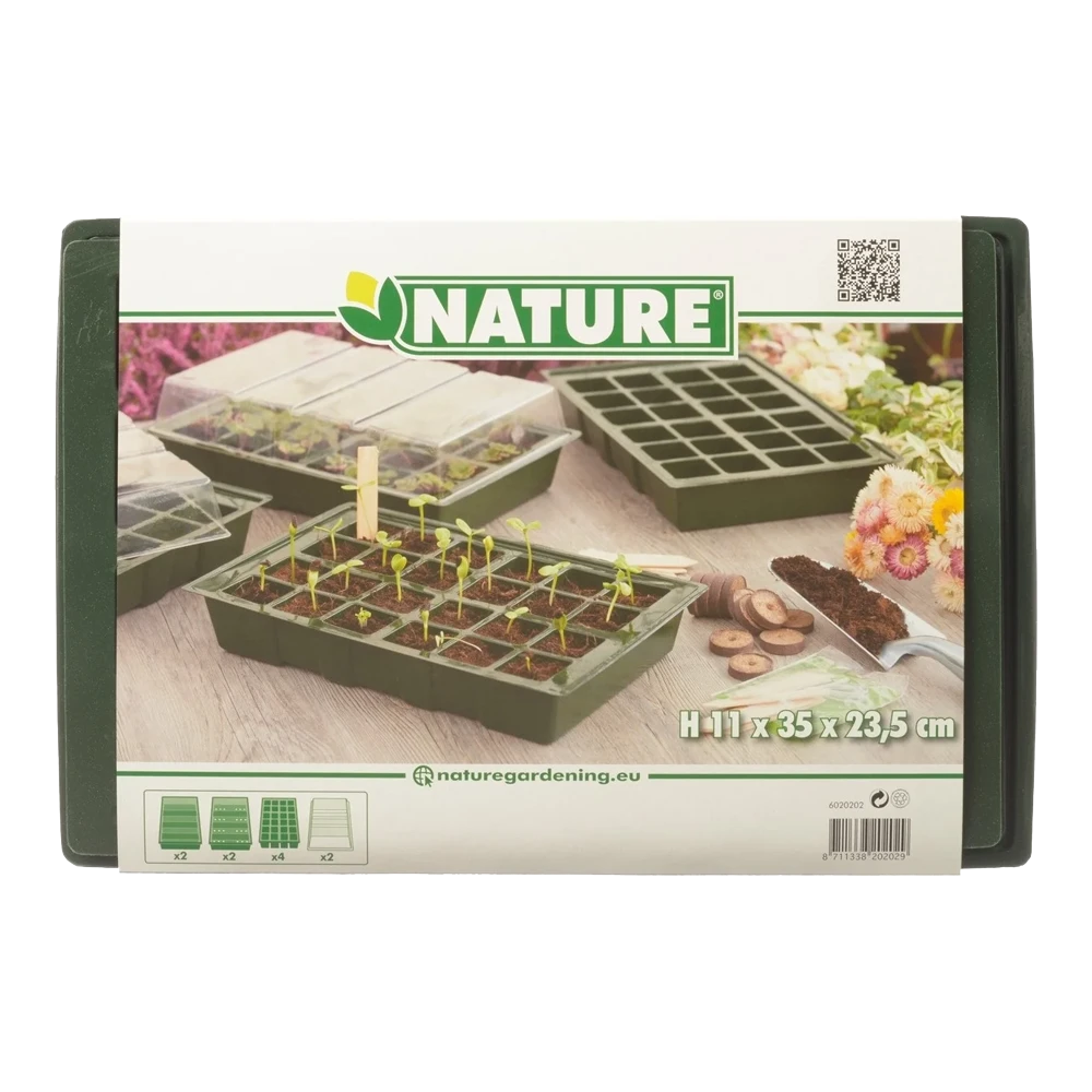 De Nature kweekbakset bestaat uit 2 transparante deksels en 4 trays gemaakt van flexibele kunststof, met elk 24 vakjes en een platte bodem, hiervan zijn 2 trays voorzien van afwateringsopeningen. Geschikt voor zaailingen van verschillende plantensoorten. Afmeting 35×23,5x11cm, inhoud set van 4 stuks.