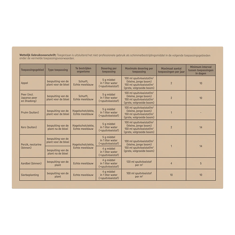 | Dosis | 4/5g middel in 1L water (=spuitvloeistof) |