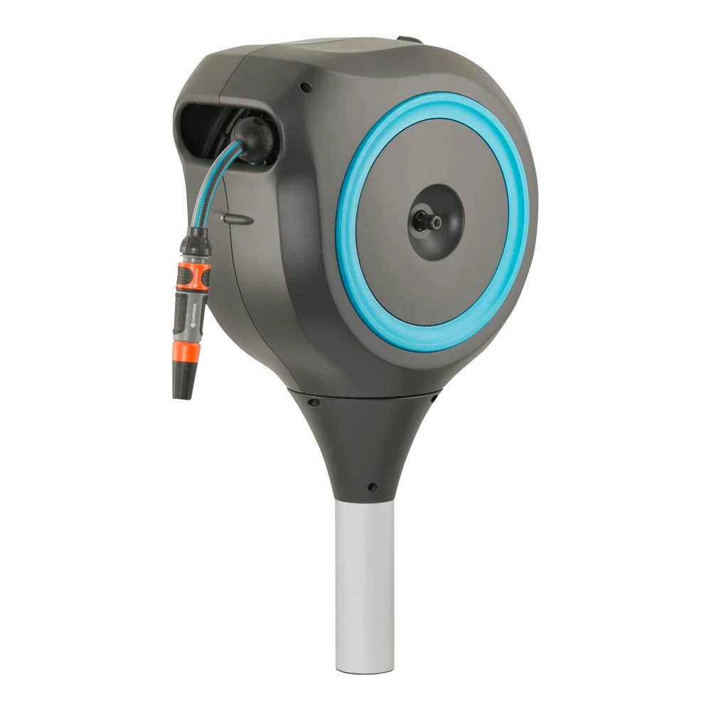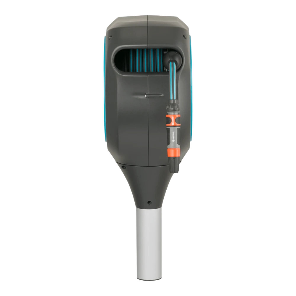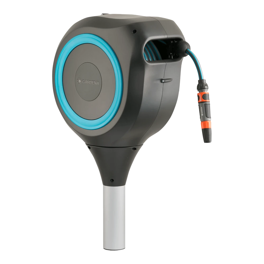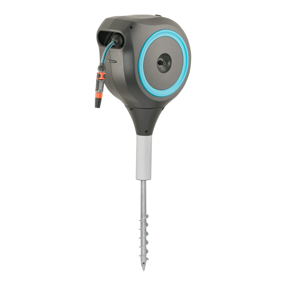 De slangenbox RollUp M van GARDENA biedt niet alleen een veilige en ruimtebesparende opslag voor uw tuinslang, maar u zult ook blij zijn met de moeiteloze bewatering van uw middelgrote tuin. De handige slangenbox wordt in de grond verankerd met een stevige standaard op een plek naar keuze in een bloembed of op het gazon. Met behulp van een bevestigingsstang kunt u de metalen pen nog eenvoudiger in de grond schroeven. Voor gebruik trekt u de 20 meter lange slang uit tot de gewenste lengte en kunt u meteen beginnen met bewateren. Dankzij de ingebouwde korte vergrendelingspunten is het hanteren van de tuinslang eenvoudiger dan ooit: zodra u stopt met de slang, wordt de vergrendeling automatisch vastgezet op de gewenste slanglengte. Het innovatieve ontwerp kan 360 graden worden gedraaid, voor maximale flexibiliteit bij het bewateren van de tuin. De box volgt altijd uw bewegingen, zodat u elke hoek van uw tuin gemakkelijk kunt bereiken zonder dat de tuinslang knikt of in de knoop raakt. Bovendien bespaart u met deze slangenbox vermoeiend opwikkelen en oprollen en hebt u geen last van vuile handen: door kort aan het uiteinde van de slang te trekken, wordt de vergrendeling ontgrendeld en wordt de tuinslang dankzij een geïntegreerde stalen veer volledig automatisch en betrouwbaar opgerold. De box heeft een praktische slanggeleider die de slang op zijn plaats houdt, zodat er geen blokkades of knopen optreden. De innovatieve RollControl-technologie zorgt voor veilig, gecontroleerd en moeiteloos oprollen zonder dat de slang in de war raakt. Het hoogwaardige materiaal is bestand tegen UV en vorst, heeft een lange levensduur en is onderhoudsvrij. De box is zeer compact en stijlvol ontworpen, zodat deze eenvoudig in elke tuin kan worden geïntegreerd. Hij is bovendien afgesteld op de hoogte van de GARDENA robotmaaiers, zodat het gazon rond de slangenbox altijd wordt onderhouden en gemaaid. De slangenbox wordt geleverd met een flexibele aansluitslang, alle benodigde montageonderdelen, de Original GARDENA System elementen en een sproeier met twee verschillende sproeipatronen. GARDENA geeft vijf jaar garantie op de slangenbox RollUp M. Bewatering die altijd gebruiksklaar is.