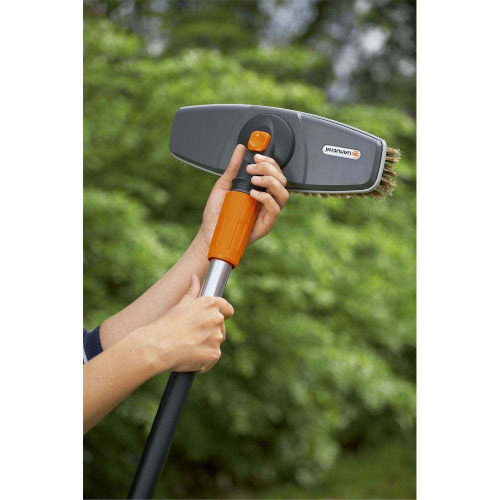 Met de GARDENA wasborstel wordt schoonmaken leuk. De wasborstel kan op het waterleidingnet worden aangesloten met de Original GARDENA System-aansluiting en heeft PET kwaliteitsharen. U kunt kwetsbare oppervlakken, zoals auto’s of caravans, voorzichtig en effectief reinigen. Sluit één van de Original GARDENA Cleansystem waterstelen aan met het aansluitstuk op de wasborstel. De wasborstel kan volledig op het draaistuk in stappen van 30° worden gedraaid en kan moeiteloos worden aangepast aan het oppervlak dat moet worden schoongemaakt. De werkbreedte is 27 cm.