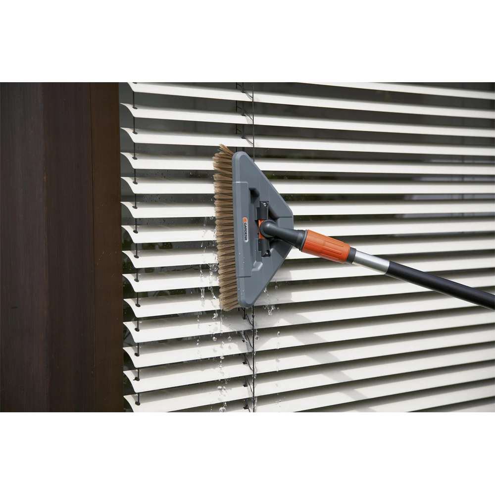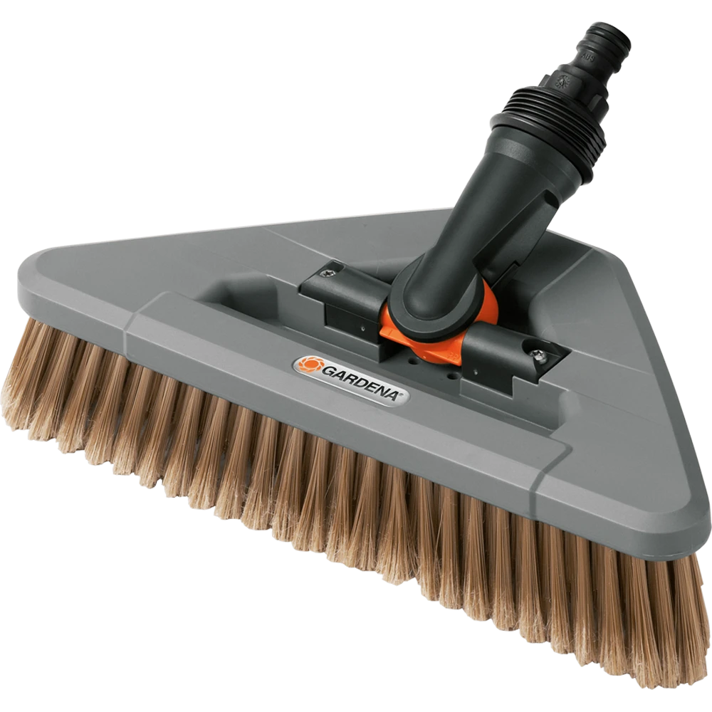 De GARDENA zwenkwasborstel kan op het waterleidingnet worden aangesloten en is voorzien van een Original GARDENA System-aansluiting. De GARDENA zwenkwasborstel heeft een praktische driehoekige vorm voor gebruik op niet-toegankelijke plekken. U kunt zonder problemen in hoeken en bochten komen die moeilijk toegankelijk zijn met andere borstels. Het draaischarnier helpt u daarbij. Het kan 360° draaien. De wasborstel is flexibel en eenvoudig in gebruik voor alle plekken. De borstel kan worden gebruikt met alle Original GARDENA Cleansystem Waterstelen (art. nr. 5552-20, 5550-20, 5554-20). Met de hoogwaardige borstelharen en een werkbreedte van 27 cm of 13 cm is deze borstel geschikt voor het zorgvuldig reinigen van kwetsbare oppervlakken, zoals rolluiken, kassen en serres. Met deze wasborstel wordt schoonmaken heel eenvoudig.